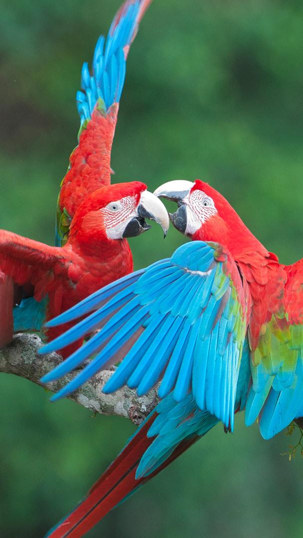 O amor está no ar! Araras-vermelhas no Buraco das Araras, perto de Bonito, Mato Grosso do Sul, Brasil (© Schafer & Hill/Getty Images)