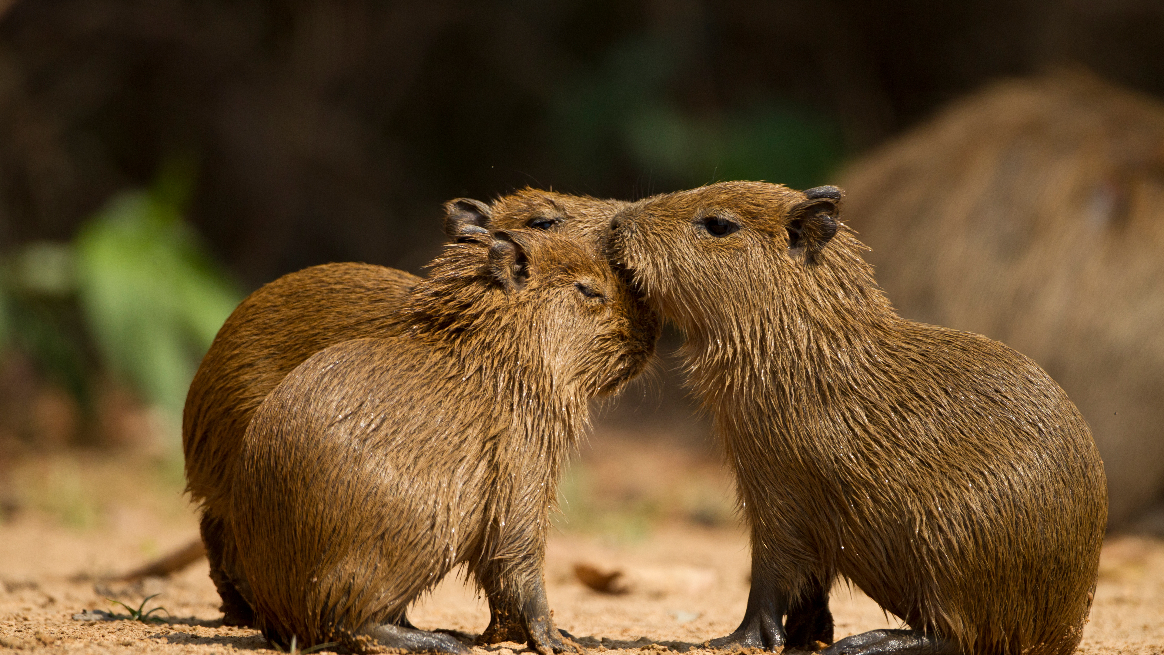 Capivaras: os Reis da Preguiça! Três capivaras juntas em um ambiente natural, Pantanal Norte, Mato Grosso, Brasil (© Joe McDonald/Getty Images)