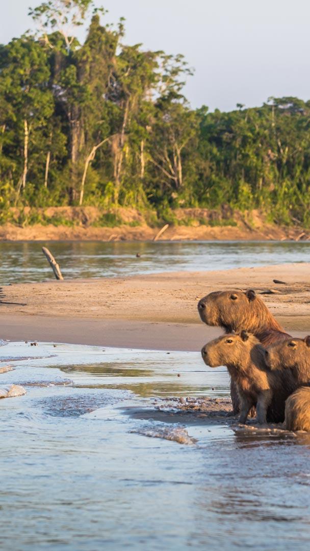 Amor que flui à beira-rio Família de capivaras às margens da floresta amazônica no Parque Nacional de Manu, Peru (© RPBMedia/iStock/Getty Images Plus)