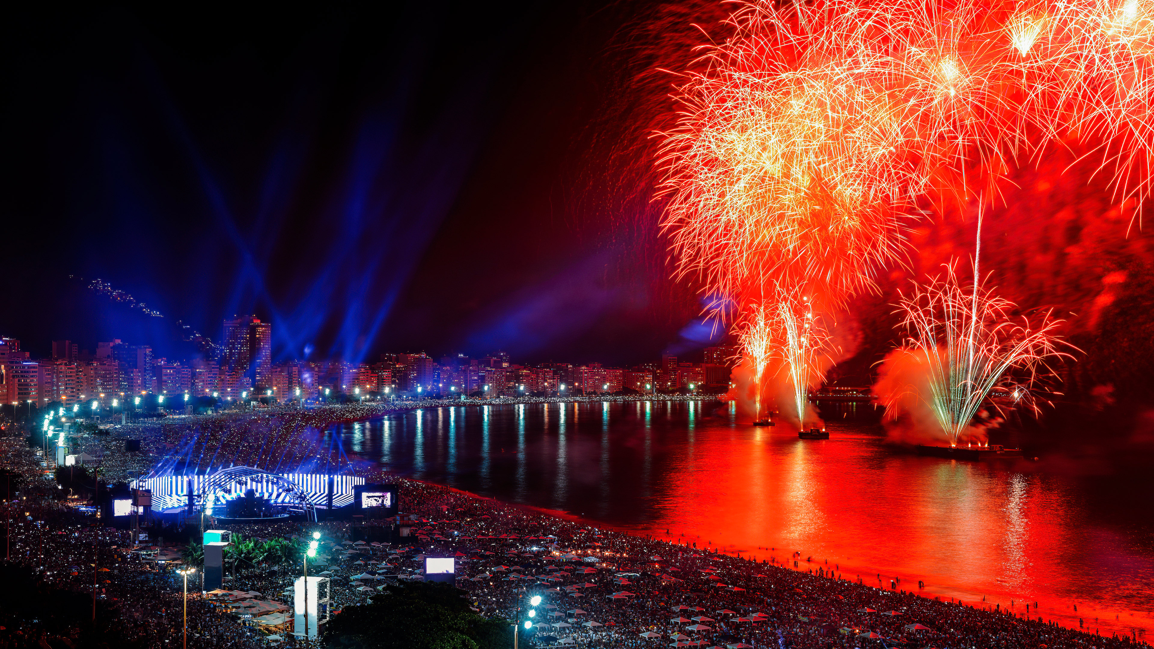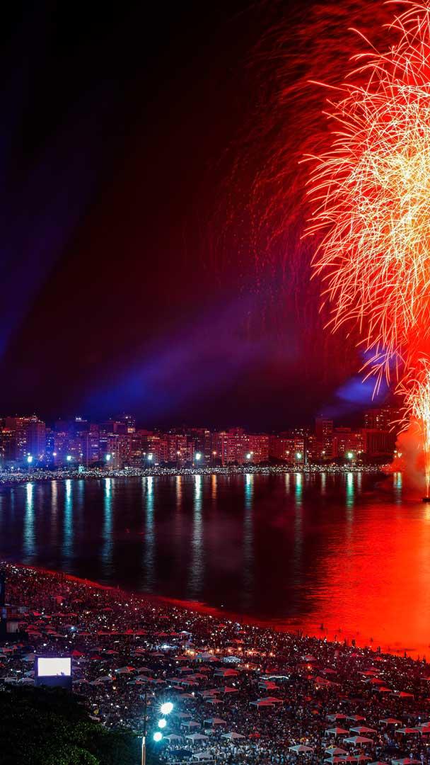 A festa da virada Fogos de artifício na praia de Copacabana, Rio de Janeiro (© BrasilNut1/Getty Images)