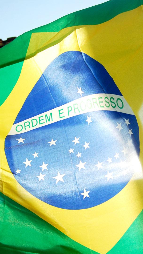 Amada terra do Brasil Bandeira brasileira voando sob o céu azul (© GideoniJunior/Getty Images)
