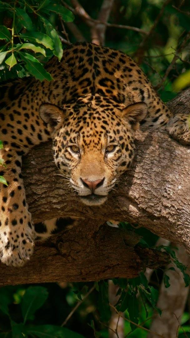 Preguiça calculada Onça-pintada observando de uma árvore, Pantanal, Mato Grosso (© Marko Konig/Getty Images)