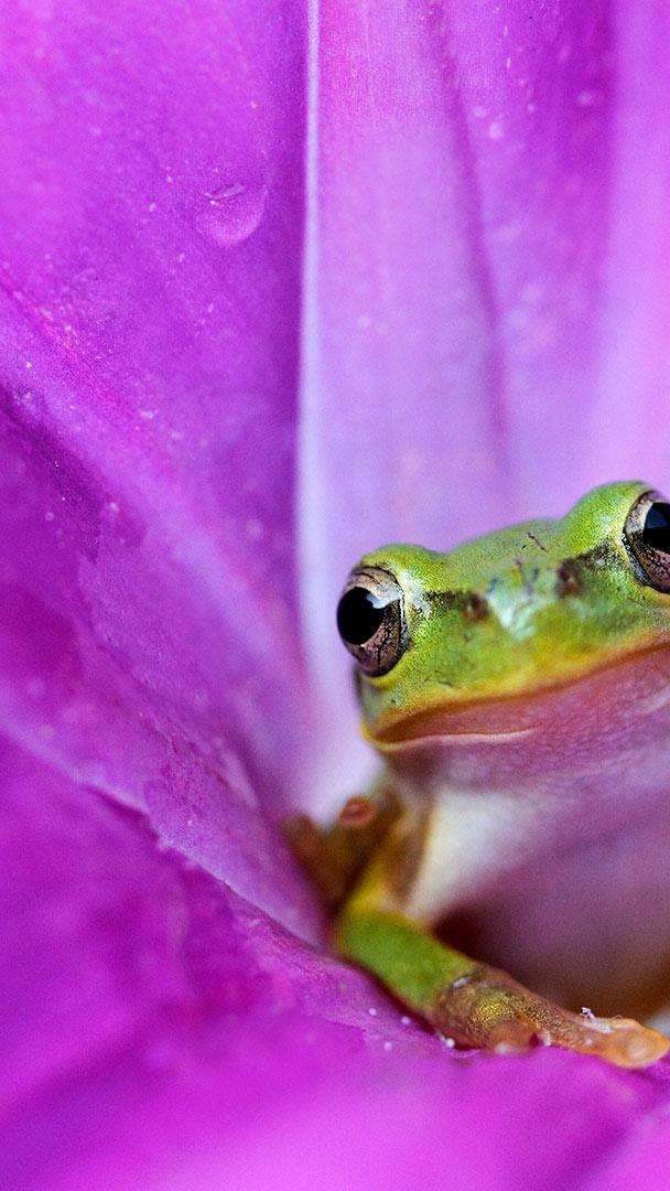 Japanese tree frog in a pink morning glory © Tetsuya Tanooka/Getty Images