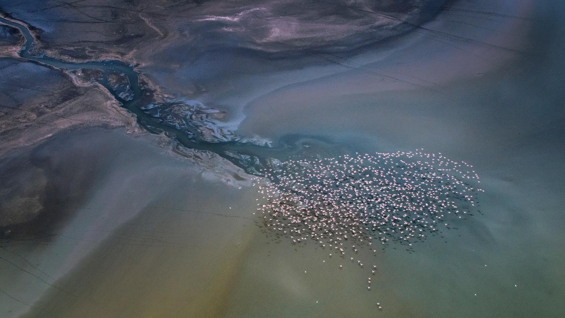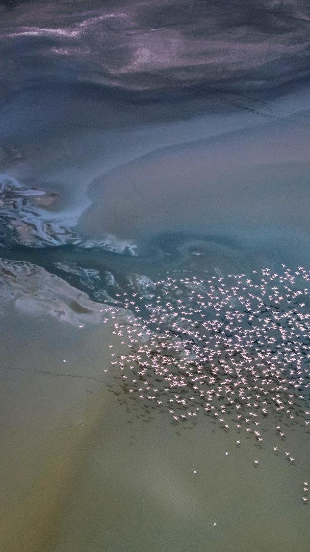 What an unearthly view! This aerial photograph shows a flamboyance of lesser flamingos against the backdrop of Lake Magadi in Kenya. The lesser flamingo is one of the six species of flamingos and is known for its vibrant pink plumage and distinctive feeding behaviour. These birds prefer to eat near the surface of the water due to the way their beaks are built. They primarily inhabit African soda lakes that have a high carbonate concentration. Lake Magadi is one of the soda lakes that are brimming with cyanobacteria and algae, providing ample nourishment for the flamingos. The spectacle of thousands of these avian wonders congregating at the lake reveals the importance of these unique ecosystems.