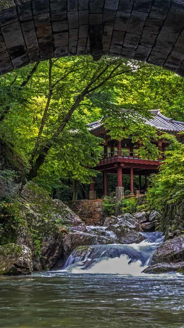 Brücke zwischen Vergangenheit und Gegenwart Seungseon-Brücke am Seonam-Tempel im Jogyesan Provincial Park, Südkorea (© Aaron Choi/Getty Images)