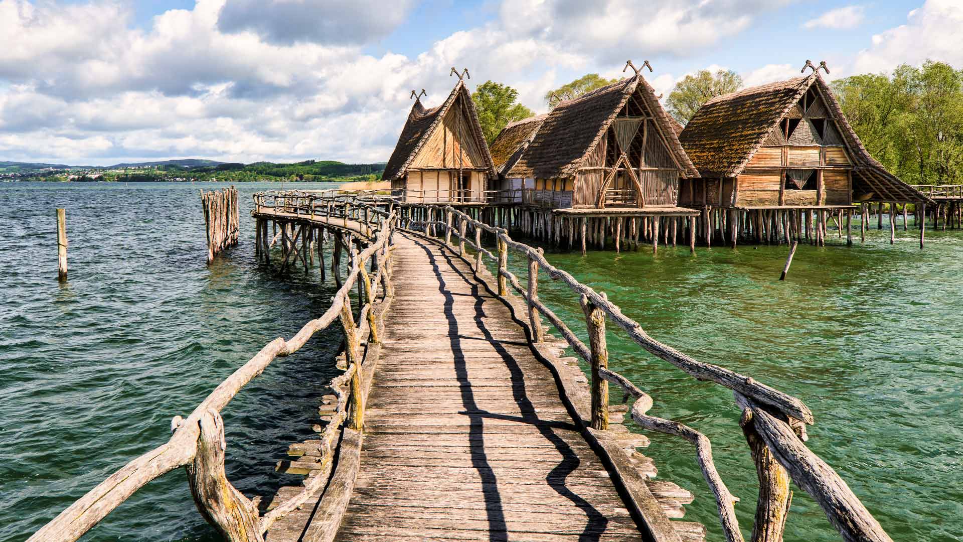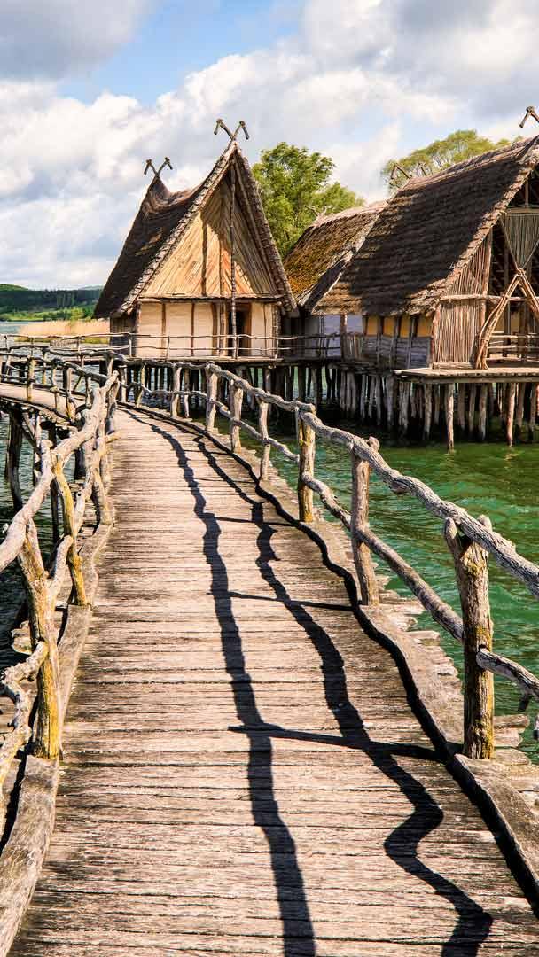 Sport, Natur und Kultur Fußgängerbrücke über den See zu den Stelzenhäusern, Unteruhldingen, Baden-Württemberg (© Harald Nachtmann/Getty Images)