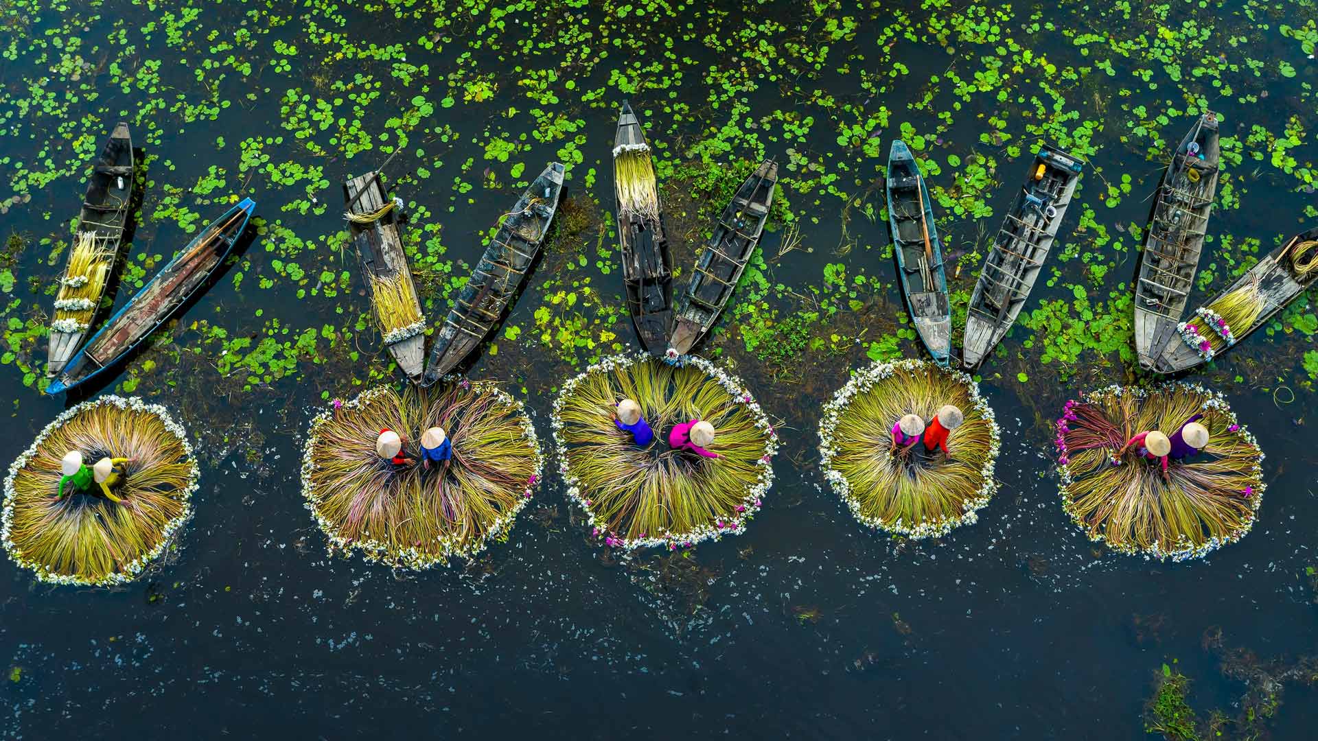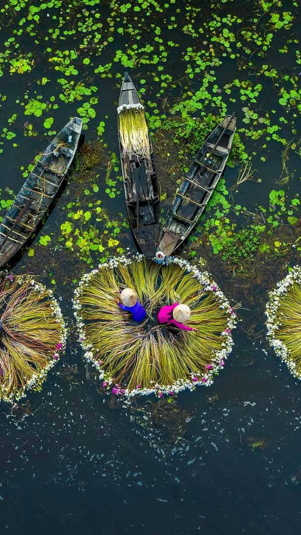 En el corazón de Vietnam, donde los arrozales esmeraldas se extienden hasta el horizonte y un caudaloso río fluye con aguas reparadoras, las crecidas se convierten en una danza anticipada entre naturaleza y cultura. El río Mekong experimenta crecidas todos los años, lo que lo convierte en un paraíso para los fotógrafos. Adornados con elegantes nenúfares o loto que se nutren de las crecidas, los agricultores de la provincia de Long An, en el sureste de Vietnam, dedican sus días a cosechar la floración de las plantas. Las inundaciones anuales aportan nutrientes, enriqueciendo los campos y ayudando a crecer a estas flores. Estos nenúfares también suministran alimentos y contribuyen a la economía de la comunidad, ya que los tallos son comestibles y la planta se puede preparar en té. Estas flores de tallo largo rinden homenaje a la capacidad de la naturaleza para generar momentos de asombrosa belleza que inspiran y elevan el alma humana.