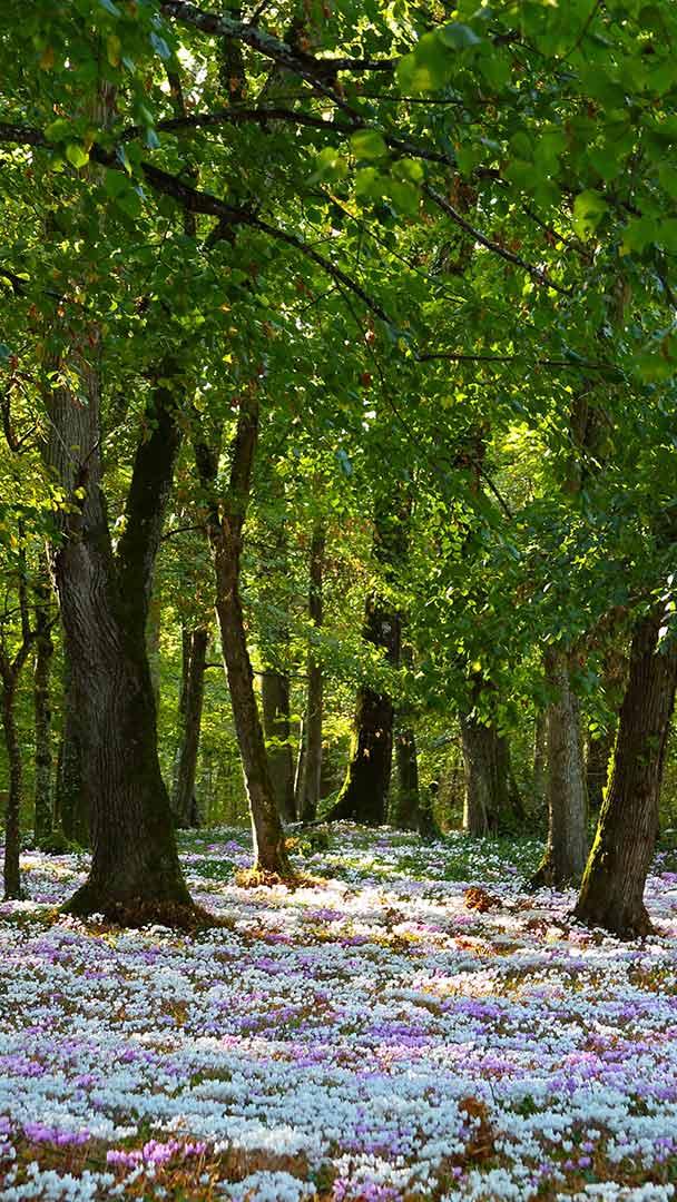 Bye-bye l’été Soleil traversant les arbres d’une forêt tapissée de cyclamens roses et blancs en Bretagne (© Rosemary Calvert/Getty Images)