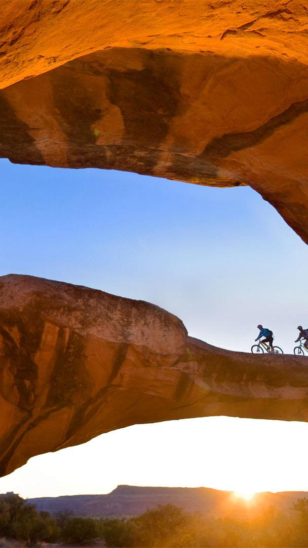 Deux roues et le ciel Cyclistes sur une arche naturelle dans le désert de Moab, Utah, États-Unis (© Whit Richardson/Cavan)