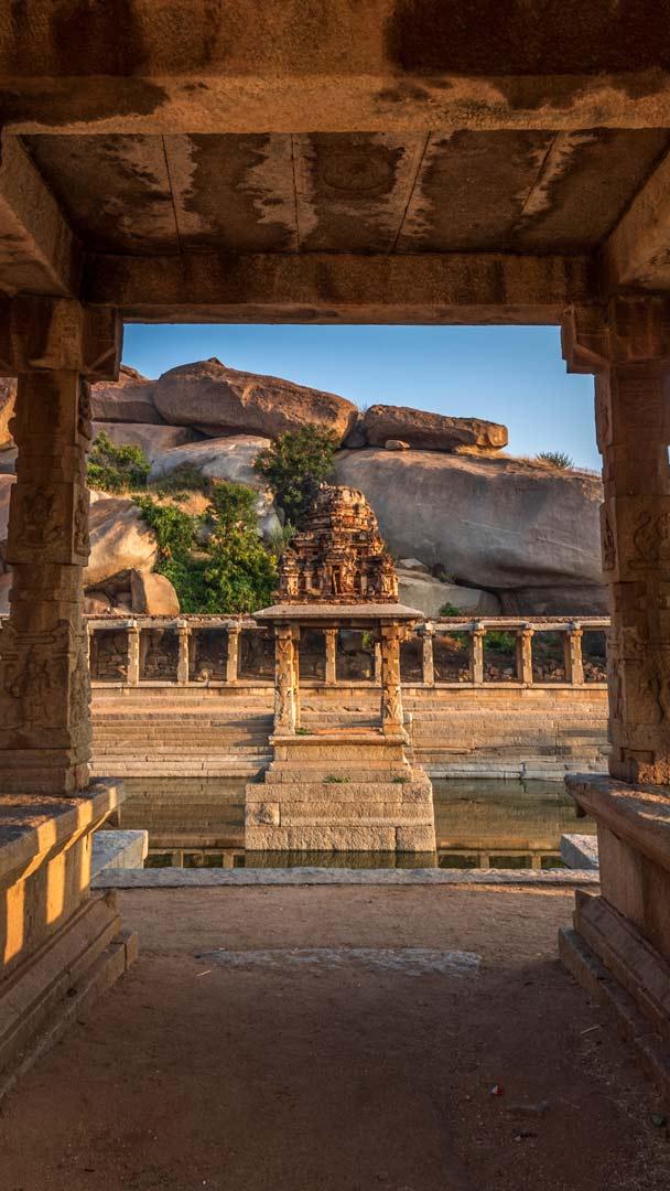 The ancient city of Hampi"s architectural brilliance is displayed in the Pushkarani water tanks. These beautifully designed tanks, with their perfectly laid stone steps, were crafted to make access to the water easy. These tanks have deep cultural significance and are highly revered. Historically, Pushkaranis were built for ritualistic temple practices or as royal amenities during the Vijayanagara Empire. In Hampi, almost every grand temple has one tank, serving both spiritual and functional purposes. The Pushkarani in front of the Sri Krishna Temple, seen in today"s image, is one of the most elegant and accessible tanks here.