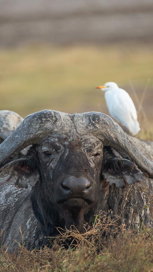 The African buffalo, a powerful and imposing creature, roams the savannas and wetlands of Tanzania, particularly within the Ngorongoro Conservation Area (NCA). Known for their large, curved horns and massive size, they are one of Africa"s "Big Five" (buffalo, elephant, leopard, rhino, lion) and are widely respected for their strength and resilience. The NCA, a UNESCO World Heritage Site, offers a dramatic and ecologically rich setting for observing these formidable herbivores.
