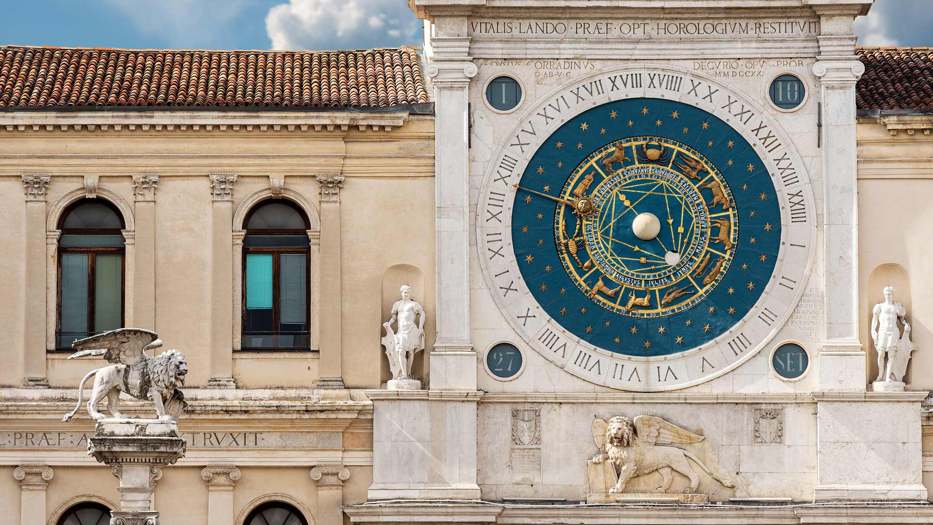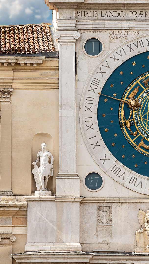 Un po’ di sonno per un po’ di sole? Torre dellOrologio e statua in marmo del Leone alato di San Marco, Piazza dei Signori, Padova, Veneto (© Alberto Masnovo/Alamy Stock Photo)