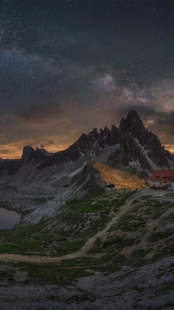 Dove si trovano queste vette? La Via Lattea sopra le Tre Cime di Lavaredo, Tirolo, Italia (© Juan Romero/Cavan Images)