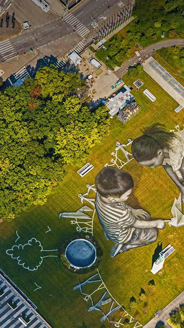 Creare un mondo migliore Opera d’arte effimera intitolata World in Progress II dellartista Saype presso la sede delle Nazioni Unite a New York City, Stati Uniti (© Valentin Flauraud/Shutterstock)