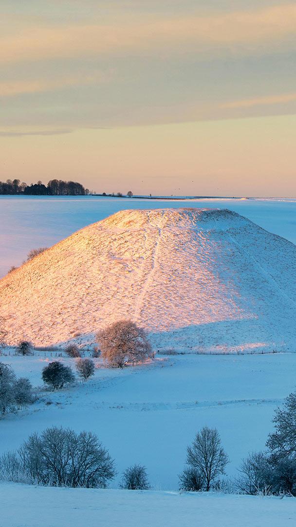 The glowing winter Silbury Hill in the winter snow at sunrise, Avebury, Wiltshire (© Tim Gainey/Alamy)