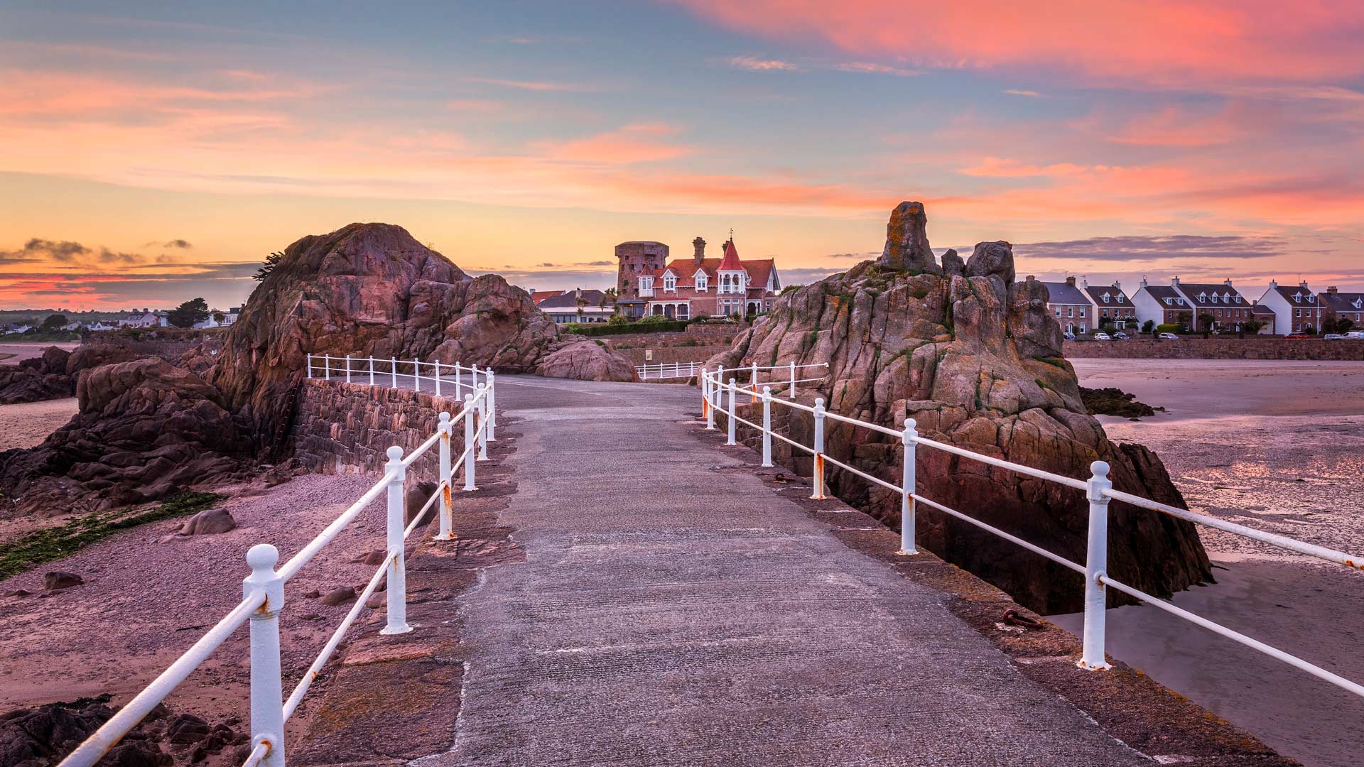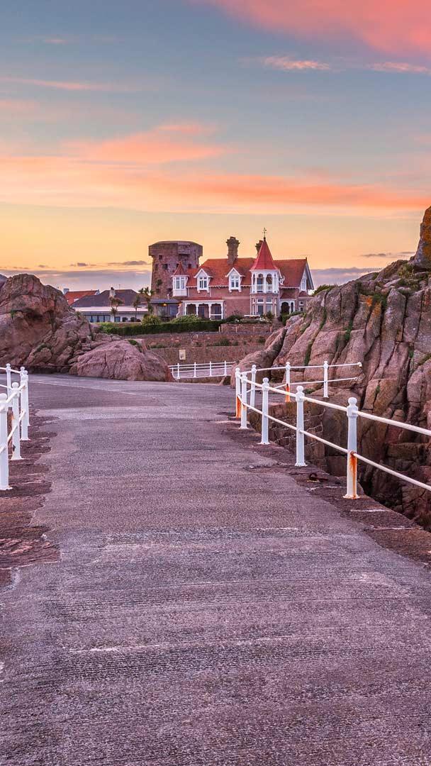 Just off the coast of Normandy, France lies Jersey, a British island with a Norse name. Found on the southeastern shore of the island is La Rocque Harbour, home to a white, sandy beach and an elevated walkway that stretches out into the water. The shoreline"s granite and plutonic rocks, which originated more than 420 million years ago, showcase a variety of colours and textures. Visible from the harbour are the round, stubby Icho Tower and the taller Seymour Tower, built in the 18th and 19th centuries respectively as coastal defence structures. Both structures are over 550 metres away from the shore and can be reached on foot with a sturdy pair of shoes, but only on the days of the year where the tide is lowest.