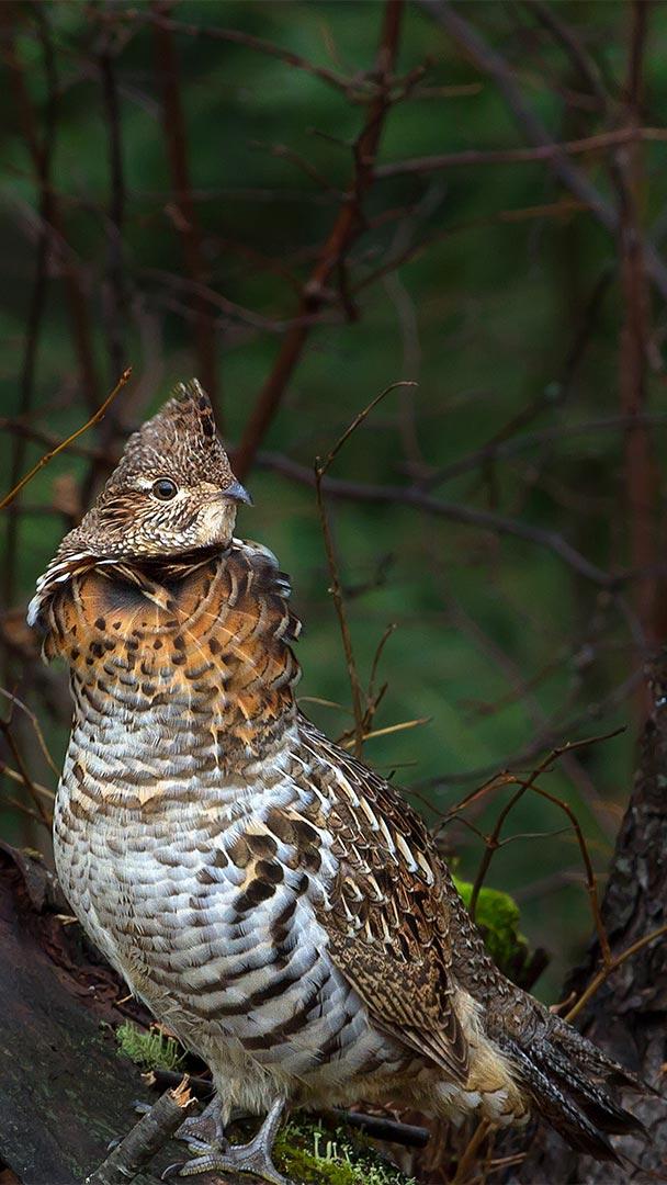 Native to forests rich in aspens and poplars across Canada and the US, ruffed grouse are nonmigratory birds who spend their entire lives in the same area. This one"s posing for us in the forest of Algonquin Provincial Park in Ontario, Canada. Depending on the habitat they"re in, their feathers can range in color from gray to red as a means of camouflage to protect themselves from predators. They get their name from the ruff of dark feathers on their neck. Despite being primarily ground-dwelling birds, ruffed grouse can be quite the acrobatic fliers when needed. They excel at flying in short spurts and are skilled at making sharp twists and turns when navigating through thick deciduous forests. How"s that for beauty and brawn?