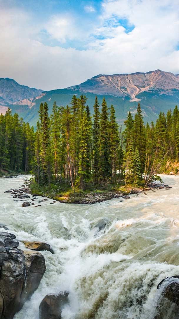 Sunwapta Falls is one of several spectacular waterfalls in Jasper National Park in Alberta, Canada. It"s actually a pair of waterfalls, a lower and an upper one, on the Sunwapta River. Their water comes from the Athabasca Glacier, so volumes are higher in the summer due to seasonal glacial melting. Jasper National Park is the largest national park in the Canadian Rockies, with more than 4,000 square miles for camping, hiking, water sports, and other activities. Wildlife in the park includes elk, grizzly bears, moose, bighorn sheep, and caribou.