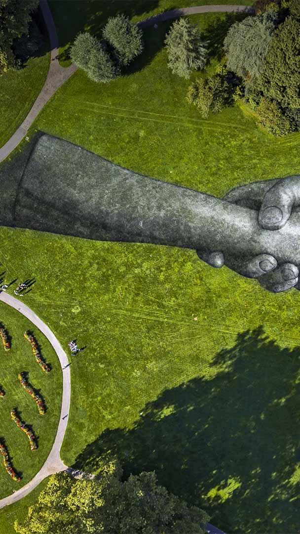 For World Refugee Day, we"re featuring an aerial view of "Beyond Walls," an art installation by the French artist Saype. In the span of five years, he aims to create the longest symbolic human chain around the world by constructing outdoor designs of interlaced hands just like this in over 20 cities. The first four were completed in 2019 in Paris, Andorra, Berlin and Geneva, Switzerland, shown here.