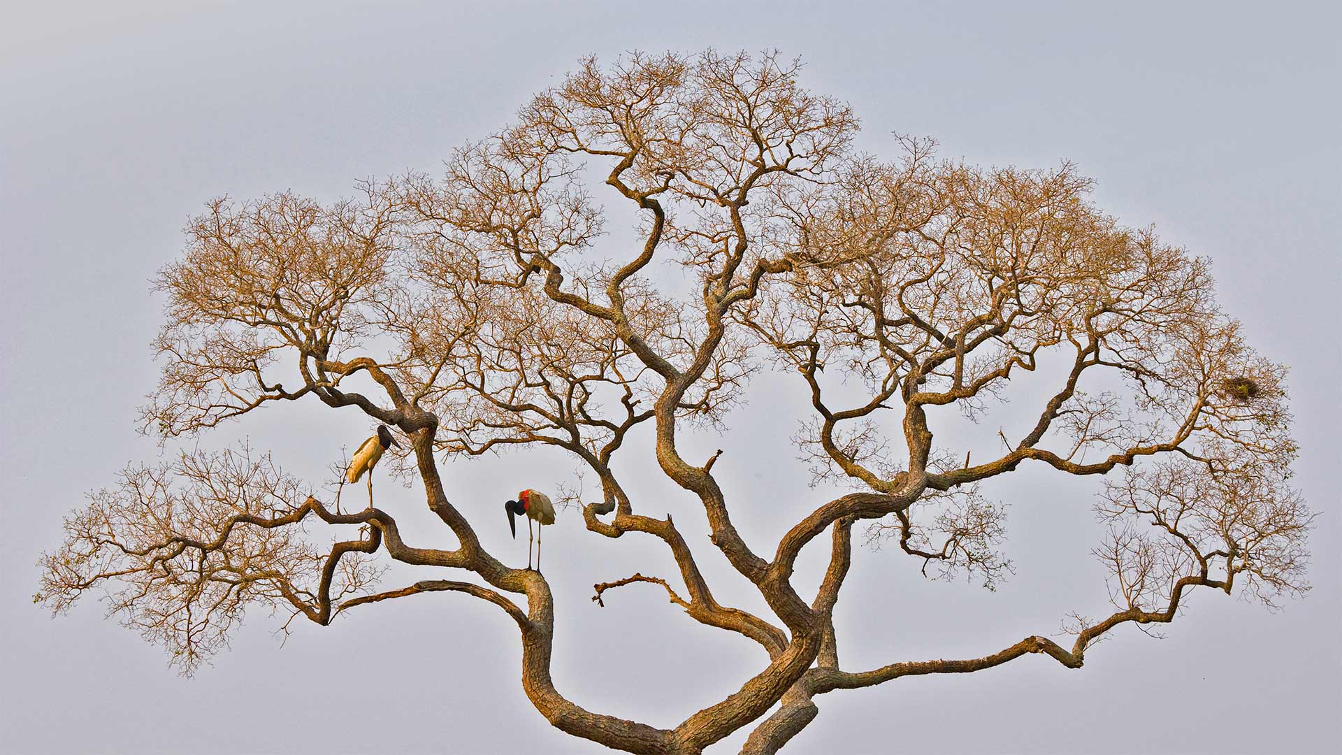 You"re more likely to see jabiru storks down on the shores of ponds or on riverbanks, where they hunt for small fish, amphibians, and lizards. They"re the tallest flying bird in South and Central America, with the largest males standing 5 feet. Despite their size, jabiru storks are graceful fliers. Here in the Pantanal, a sprawling tropical wetland in western Brazil, jabiru storks will build a massive nest in late August or September—just as spring is beginning in the Southern Hemisphere. The stork mates in this image may be scouting out a good place for their nest. And once it"s built, the pair will raise anywhere from two to five jabiru stork chicks.