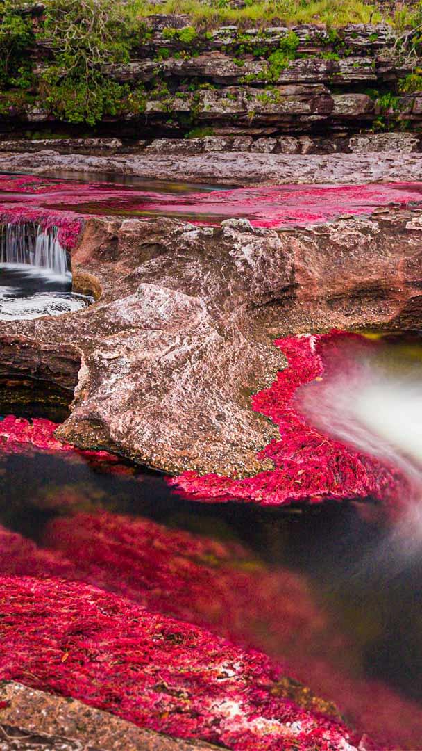 Today"s photo brings us to the banks of Caño Cristales, the "liquid rainbow" that cuts a prismatic path through the heart of Colombia. From June through November, when the clear water is low, the abundant underwater plants that cover the riverbed show off their red, yellow, green, and blue hues. The star of the show—especially in this photo—is Macarenia clavigera, a riverweed that ranges from bright red to deep crimson or purple depending on its intake of sun rays. In August and September, when the florid flora is at its peak, the river"s a coveted nature excursion: Because the ecosystem is so fragile, visits are limited to guided tours.
