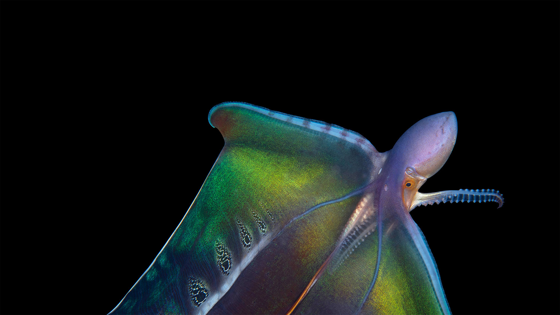 You might look twice if you passed by this Technicolor sea creature gliding through the ocean water. In celebration of World Octopus Day, we"re marveling at a photograph of the rarely seen blanket octopus, near Palm Beach, Florida. The blanket octopus gets its common name from the sheets of webbing that stretch between some arms of the female, like the one pictured here. When threatened, it spreads out its arms, creating a blanketlike silhouette to intimidate would-be attackers.