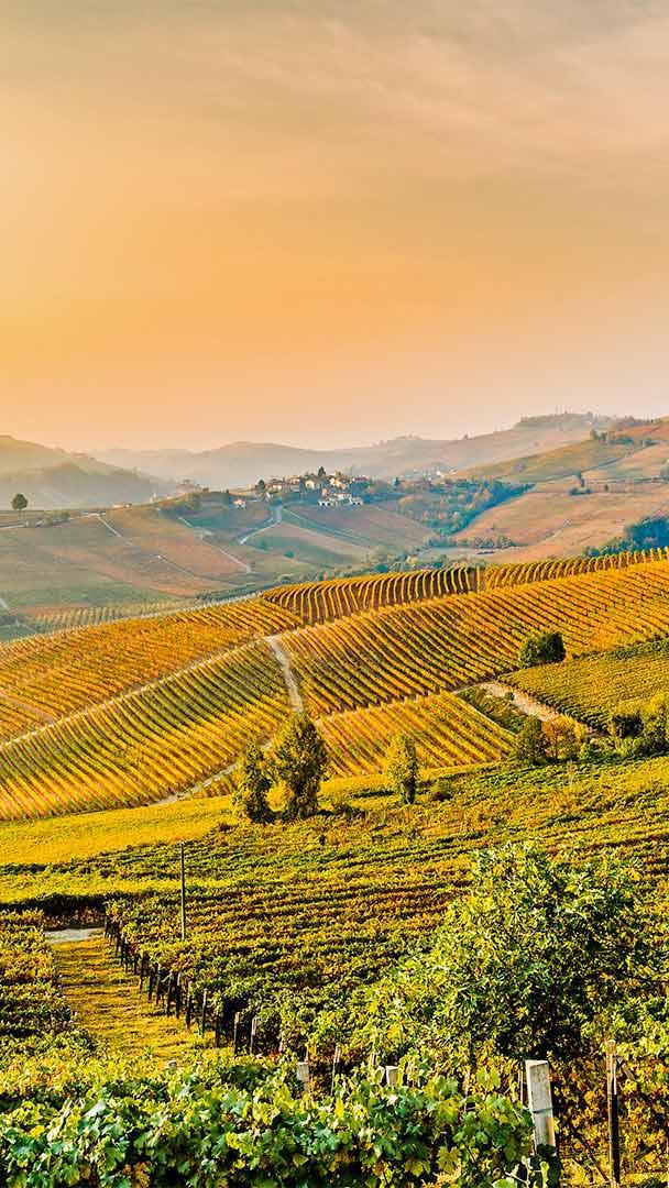 This beautiful fall scene is in the Langhe area of Piedmont, one of the great wine regions in Italy. More specifically, we"re looking at the hills of Barolo, a town famous for its locally produced wine of the same name, made from Nebbiolo grapes. In addition to wine, Piedmont is known for its truffles, which are harvested this time of year. Piedmont chocolate is also highly prized. Bicerin, a popular coffee-chocolate drink from the city of Turin (which hosted the 2006 Winter Olympics), has been around since the 18th century. The piemontesi, as locals are called, know how to eat and drink. Salute!