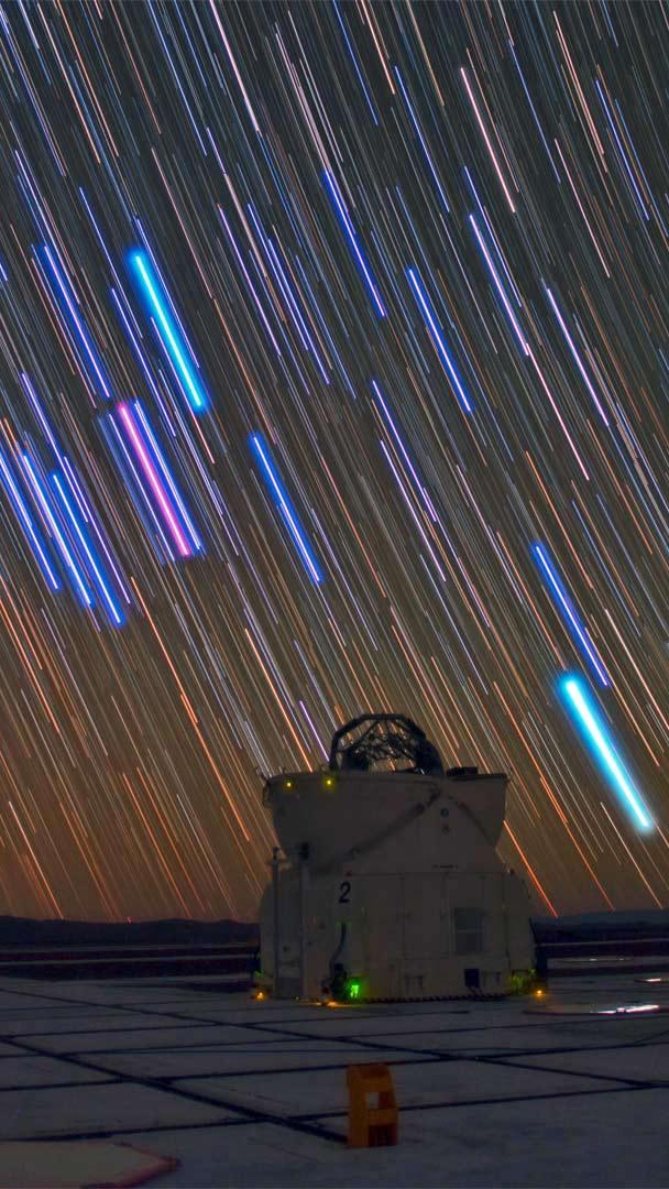 No, that"s not a downpour of lightsabers—but it"s no typical night sky either. Stargazing here at Paranal Observatory, on a mountaintop in Chile"s desolate Atacama Desert, you"ll get one of the clearest possible naked-eye views of the southern skies. This "lightsaber" effect comes from the photo"s long exposure: What we"re seeing is these stars" paths as they track across the night sky due to our planet"s rotation. The dazzling colors indicate temperature, from chilly red (5,000-ish degrees Fahrenheit) to balmy blue (temps in the tens of thousands).