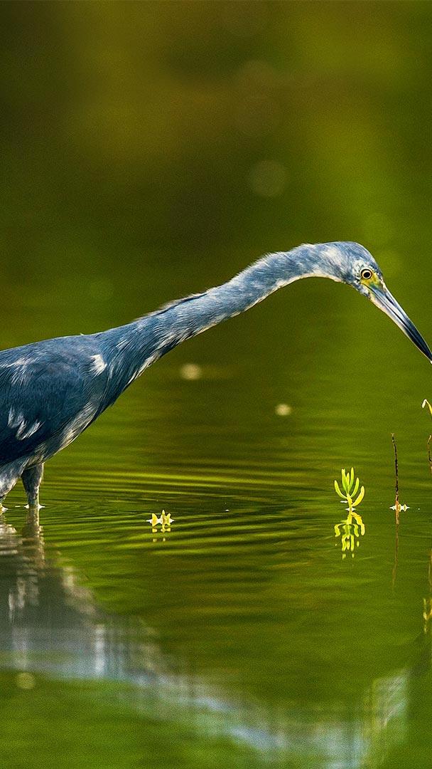 If you want to see a little blue heron in its natural habitat, head to the swamps, tidal flats, and lake marshes of the US Gulf Coast, the Caribbean Islands, and Central America—and bring your patience. These herons keep a low profile, and often sit so still while hunting, they can be hard to spot. The adults develop deep blue plumage, sometimes sporting purple feathers on their heads, and tiptoe around the shoreline on green legs. The chicks are born snowy white, which scientists suggest is a survival adaptation to help them blend in with cattle egrets and snowy egrets—both species with bright white feathers—to enjoy the added safety of being in a large group.
