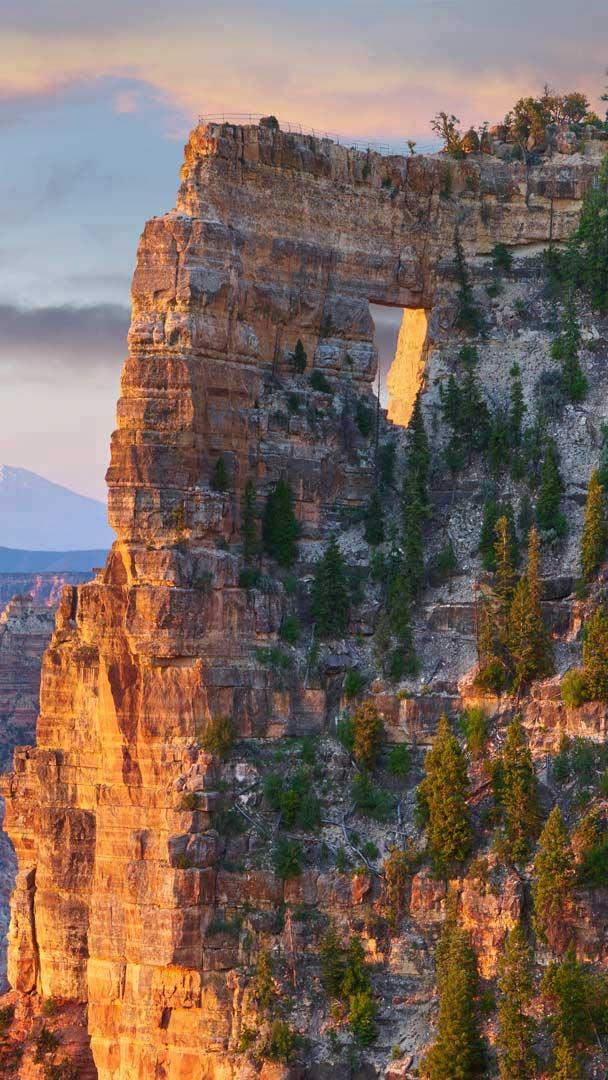 On the National Park Service"s Founders Day, we"re here on the North Rim of Grand Canyon National Park in Arizona peering out at the stunning vista. Can you see the rectangular hole in the canyon wall near the top of the image? That"s Angels Window. Brave hikers can make their way up to the trail above it, but the window itself is best viewed from various points along the North Rim. Far down below is the Colorado River. Beginning about 6 million years ago, it gradually carved downward through countless layers of sedimentary, igneous, and metamorphic rock. The Colorado and its tributary streams continue to deepen and widen the Grand Canyon even today.