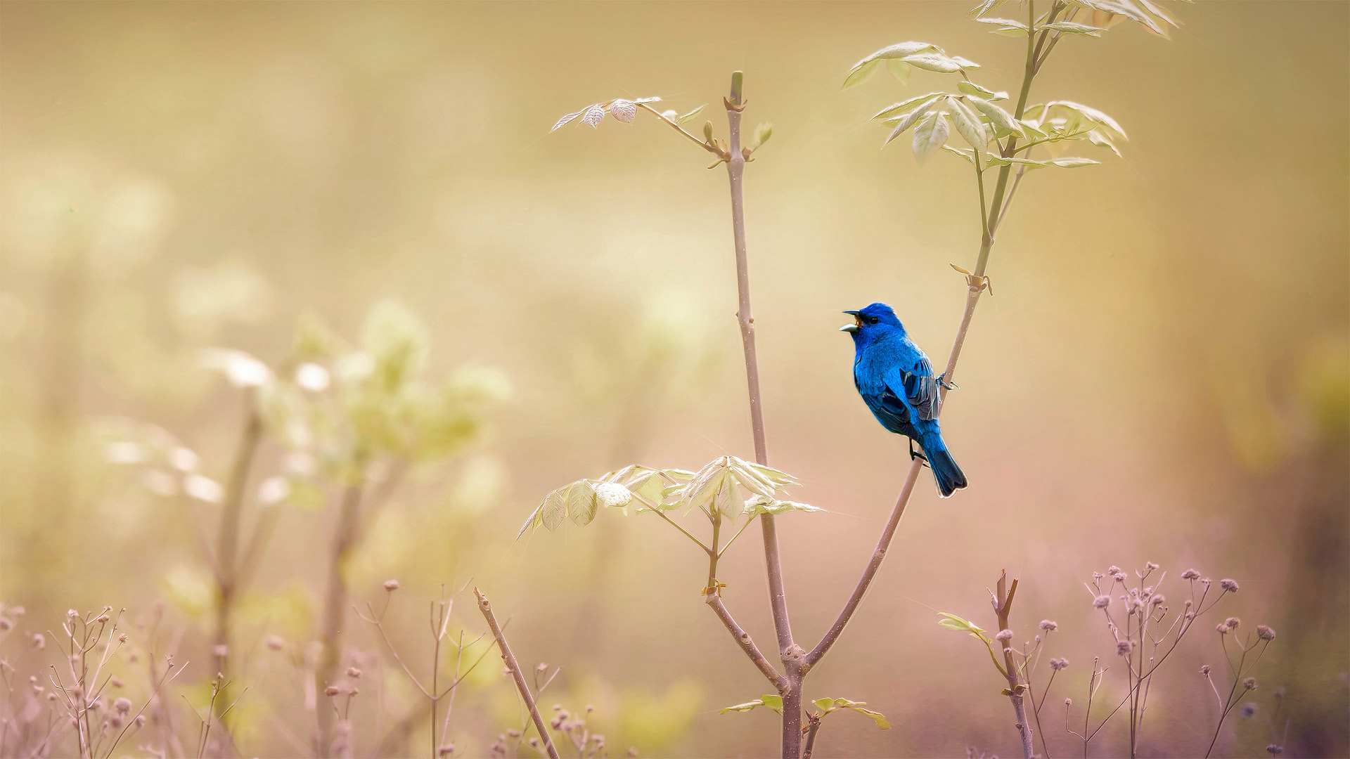 This time of year, from late spring to summer, male adult indigo buntings take it up a notch and turn a brilliant deep blue. They fly up to a perch—like our cheerful fellow atop a branch—and sing from morning to night to defend their territory from other males and to catch the attention of females. Indigo buntings are members of the "blue" clade (subgroup) of the cardinal family.