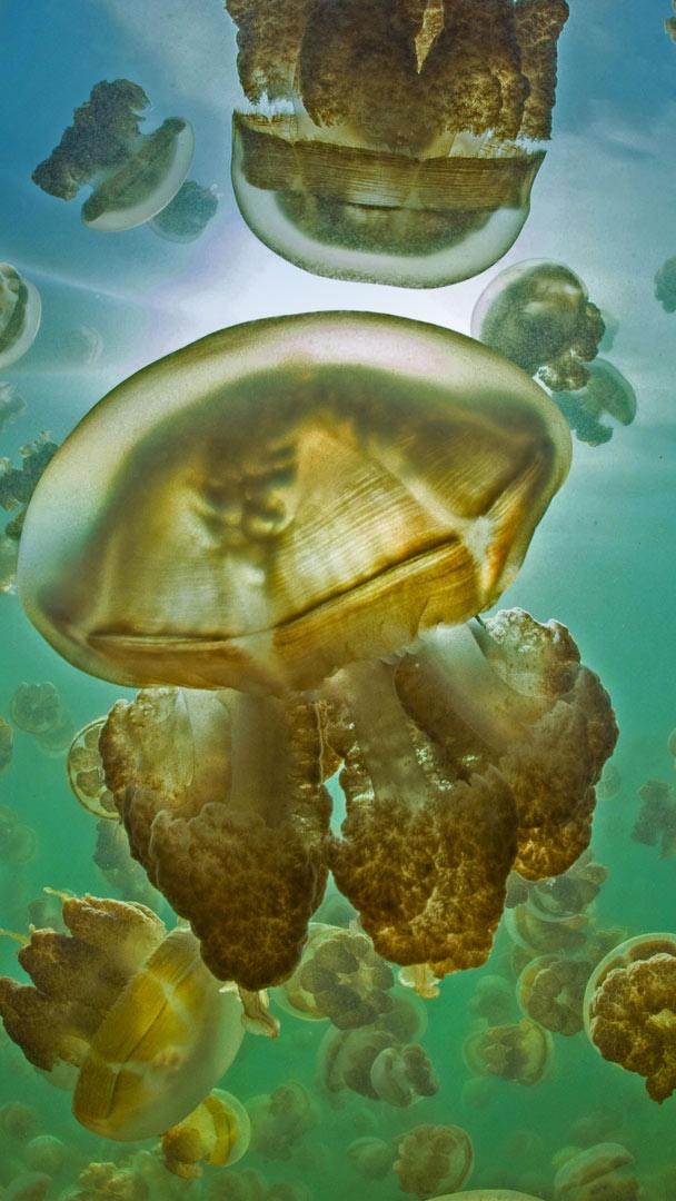 If you"re lucky enough to see this view through the lens of your diving mask, you must be snorkeling in Jellyfish Lake on the island of Eil Malk in the Pacific island nation of Palau. Golden jellyfish are a subspecies unique to this small lake, on this small island—they"re found nowhere else on the planet. Millions of teacup-sized golden jellies inhabit the lake, following the sunlight that nourishes them. Symbiotic algae live inside the jellyfish and provide their hosts with energy as a byproduct of photosynthesis. The more sun the jellies get, the more energy they derive from their hitchhikers. The jellies start the day at the east end of the lake and drift westward until dusk, following the arc of the sun.