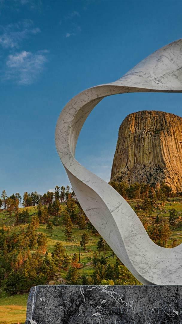 We"re celebrating Indigenous Peoples" Day by peering through the sculpture called "Circle of Sacred Smoke" aka "Wind Circle" or "Circle Wind" at Devils Tower, one of the most famous rock monoliths in the US. The "Circle," sculpted by Japanese artist Junkyu Muto and installed in 2008, is the third of seven "peace sculptures" placed around the world. Twelve feet high and made of white marble, it"s intended to evoke a puff of smoke from a Native American ceremonial pipe.