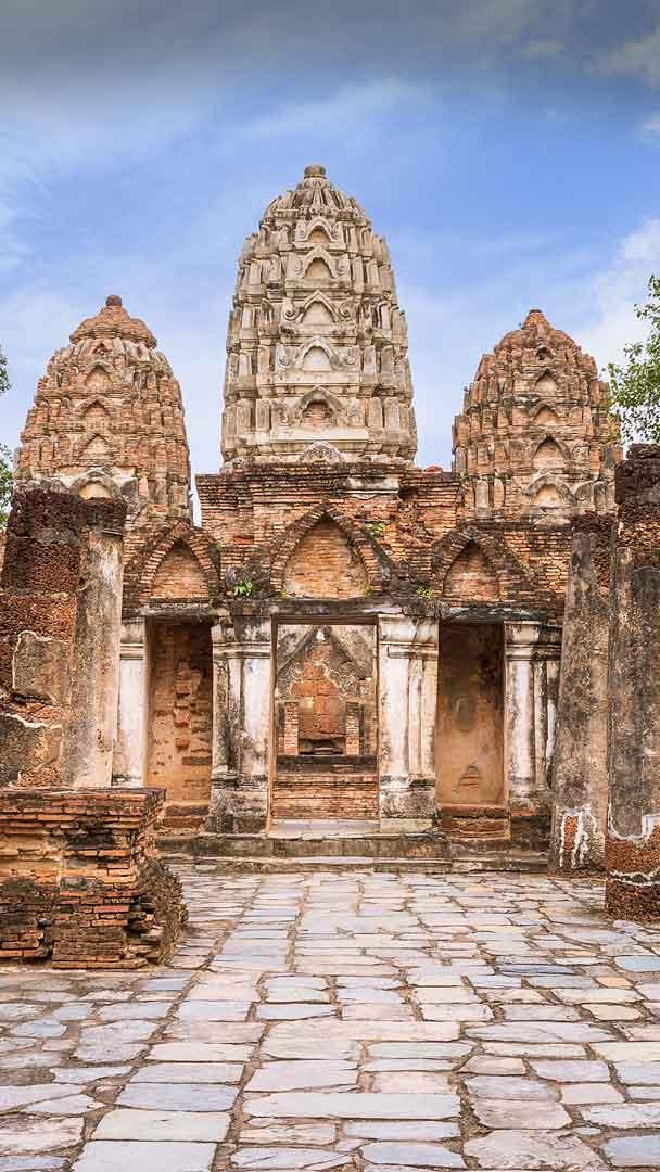 Welcome to Sukhothai Historical Park, one of Thailand"s most spectacular UNESCO World Heritage sites. The park is dotted with ancient temples, the remains of a palace, and towering Buddha statues—within its boundaries is the historic town of Sukhothai, an important metropolitan hub in the 13th and 14th centuries. The name translates as "the dawn of happiness" and you can spend many happy hours here, strolling among the beautiful lawns, trees, and lakes. The temple on our homepage is Wat Si Sawai, one of the oldest on the site, founded in the late 12th or early 13th century. Sukhothai was the capital of the first Kingdom of Siam more than 700 years ago and this historic site continues to offer a window onto what is sometimes seen as a golden age of Thai civilization.