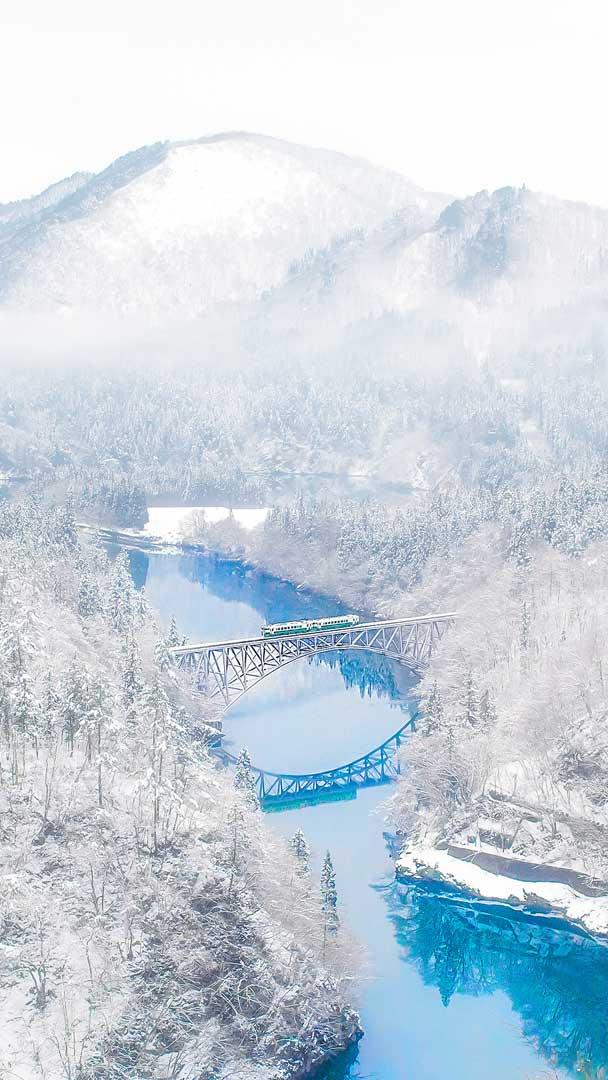 The Tadami Line is one of the most scenic railway lines in Japan. It winds through beautiful landscapes over 84 miles from Aizu-Wakamatsu, Fukushima prefecture, to Uonuma, Niigata prefecture. As travelers cross the Daiichi Tadami River Bridge, pictured in today"s image, they are treated to gorgeous vistas of the river below and the forests that blanket the area. After a snowfall, the icy blue water of the Tadami River cuts a bold streak through the forest, providing a welcome splash of color in a blanket of white.