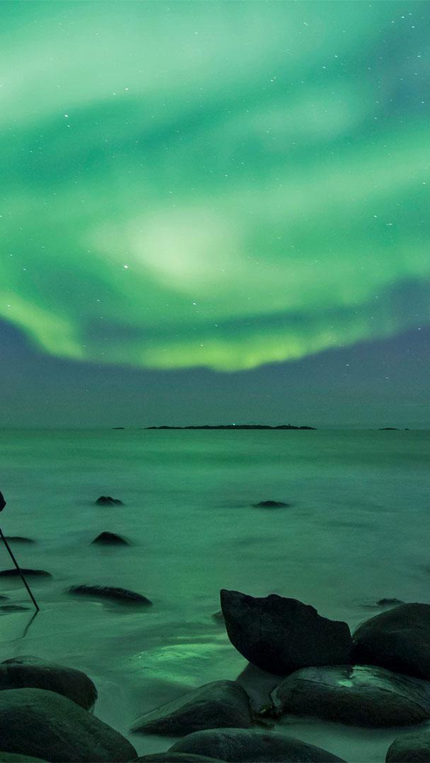 We’re celebrating Camera Day by getting a glimpse of what goes into taking a good photo. In the case of today’s image, that means standing in the cold surf on a beach in Norway at night, while keeping the shutter on the camera open long enough to capture something as ephemeral as the northern lights. Ask any experienced nature photographer: as glamorous as all the travel might seem, much of the job requires patience.