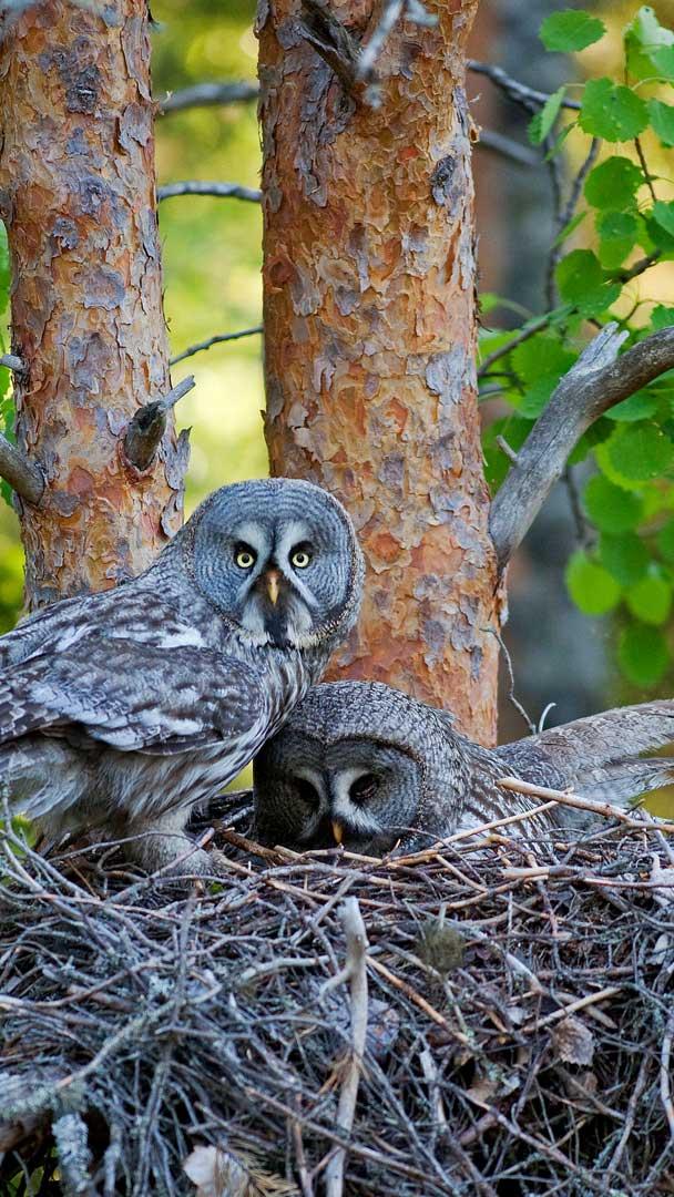 Great gray owls in their nest, Finland © imageBROKER.com/Alamy